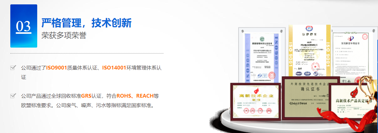 公司拥有专业的研发团队,根据客户要求定制开发,快速提供样料试样,满足客户新产品开发要求。专业的检测人员对每一批产品进行全性能检测,产品出厂时都会提供性能检测报告,质量好,有保障! 可提供无卤证书、UL黄卡、氧指数、烟密度、灼热丝证书等。公司通过了ISO9001质量管理体系、ISO14001环境管理体系和ISO45001职业健康安全体系,全球回收标准GRS认证。